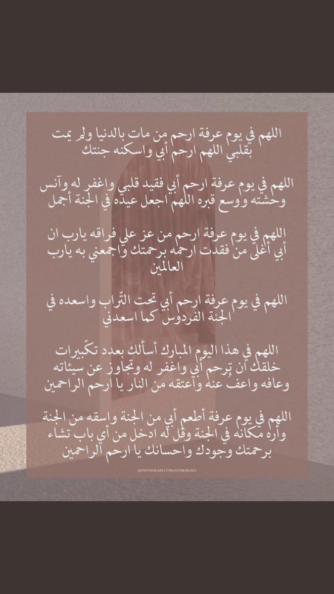 اللهم أرحم من أصبحوا في ودائعك وبرد على قبورهم وأعف عنهم وأجعلهم مكرمين في جنانك عمي. اللهم في يوم عرفه أغفر لأبي وارحمة وأجعله من اهل الجنه وسخرني لفعل الخيرات له 懶 اللهم وإجعلني سببًا في تنعمه في قبره الى حين لقائي به في جنتك اللهم أرحم أبي رحمة تقر بها عينه وتسعد بها روحه. اللهم في يوم الجمعة أن ر قبور موتانا واجعل ملائكة الرحمه تط وف عليه. On fathers day remember your father with prayers. دعاء يوم عرفة للميت ليدي بيرد.
